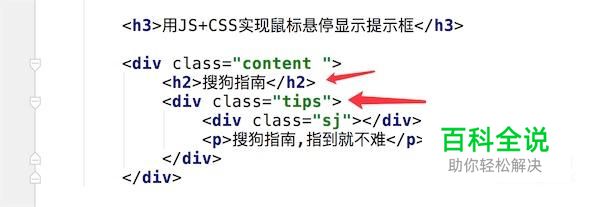 我们为内容添加CSS样式, 为tips的父容器添加样式:position: relative; tips添加样式: position: absolute; 这样主要是为了让悬停的显示提示框好定位。 再为提示信息添加一些美化样式,代码如图。