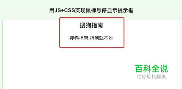 最后看下整个效果。当我们鼠标放到‘搜狗指南’这个标题上时,提示框就会显示出来了,移开就会隐藏提示框。
