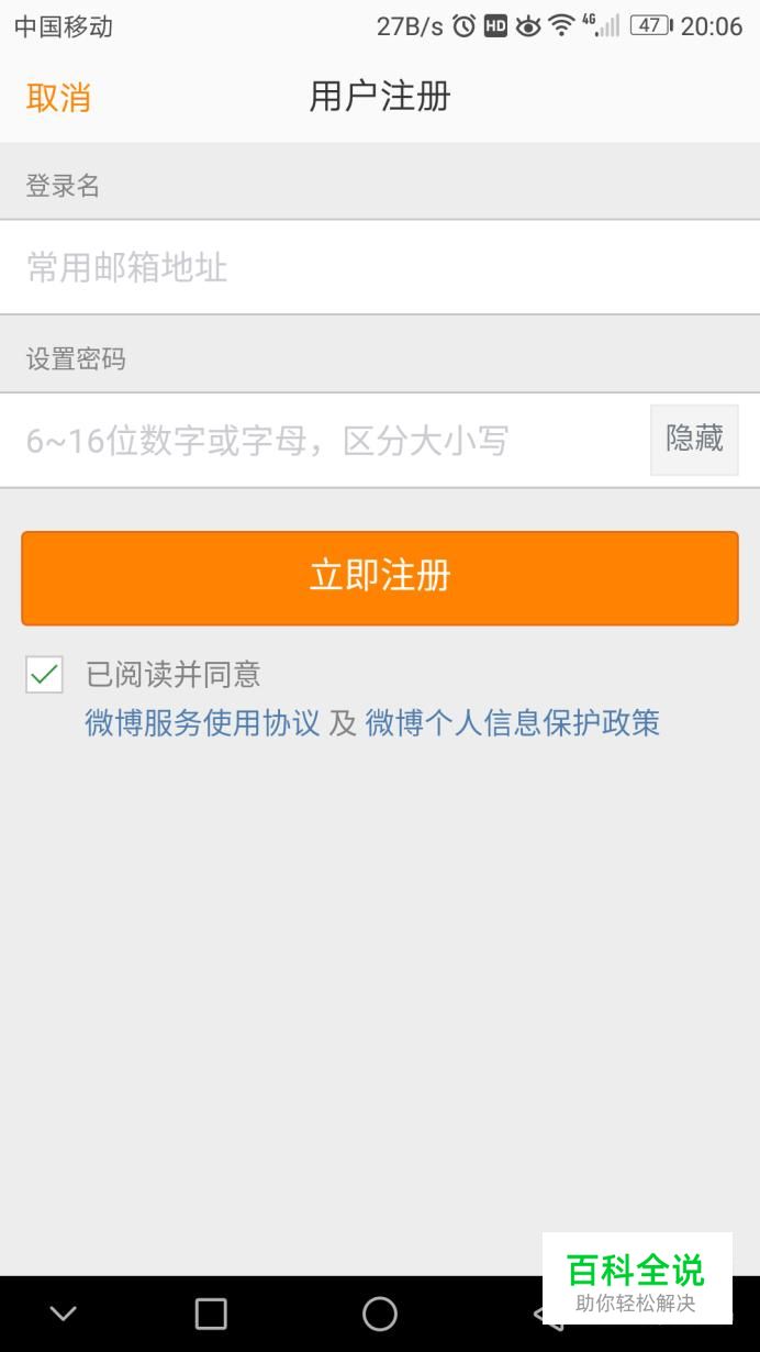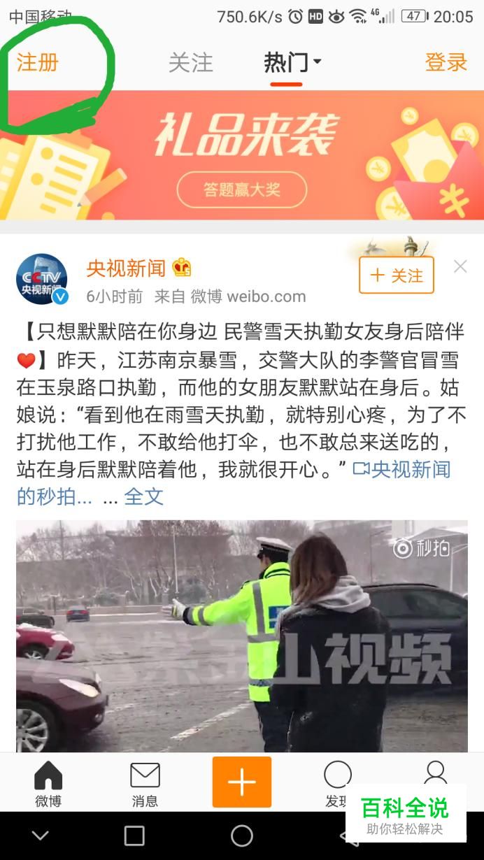 打开微博,接受相应授权,接着点击左上角“注册”按钮。