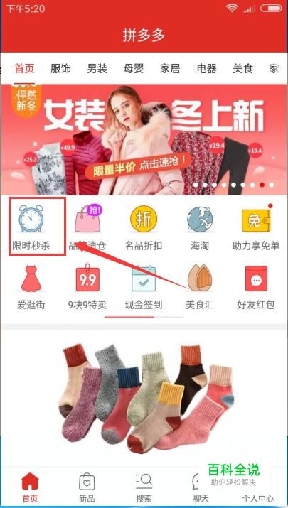 打开拼多多APP页面,在此窗口左侧找到并点击”限时秒杀“按钮,进行秒杀自己 想要的物品。