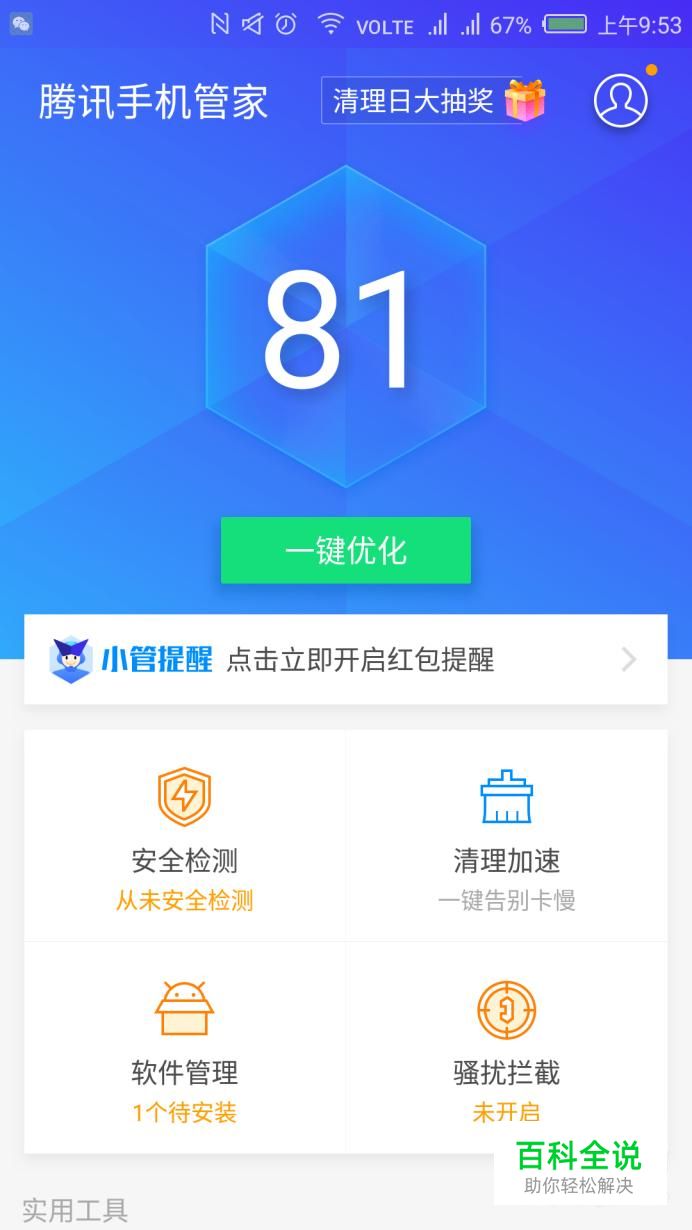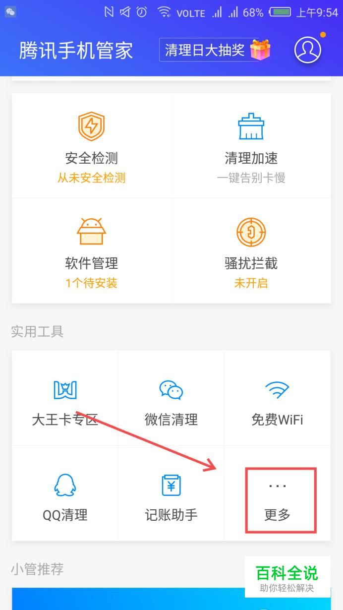 首先打开腾讯手机管家,进入主页面后向下翻看,在“实用工具”一栏里找到“更多”,点击进入。