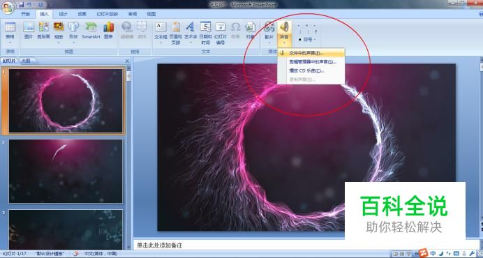 第一步:点击“插入”,选择“声音”这里可以选择自己的音乐。