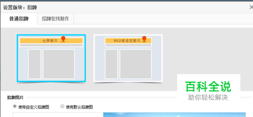 首先我们先进入阿里巴巴,店铺装修页面,点击设置进入店铺招牌装修,因为我们选择自己动手制作招牌,所以如下图,选择普通招牌制作,在普通招牌制作下方,建议选择全屏展示,这样的店招比较大气美观,并选择自定义招牌图,系统提示的尺寸是1440-1920像素(宽度),90-200像素(高度)。