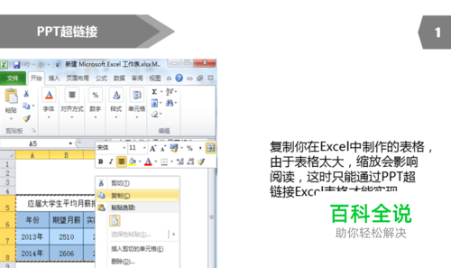 1.复制你在Excel中制作的表格,由于表格太大,缩放会影响阅读,这时只能通过PPT超链接Excel表格才能实现。