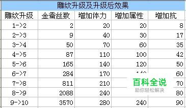 2.雕纹:这儿阐明一下兵器和护腕为何不选减抗,由于减抗雕纹晋级需求3倍于普通雕纹的金蚕丝数量,极不合算。下面是1件配备雕纹报价:(每个金蚕丝35YB)1级雕纹的报价是:480YB(第三讲有算过)5级雕纹的报价是:(2+9+50+87)*35+480=5660YB7级雕文的报价是:(2+9+50+87+165+284)*35+480=21375YB下图为各等级晋级需耗费金蚕丝数与晋级后效果: