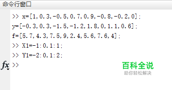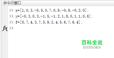 假设给定一个矩形区域-1≤x≤1,-2≤y≤2. 并假定在该区域上有8个离散点,坐标为: x=[1,0.3,-0.5,0.7,0.9,-0.8,-0.2,0],y=[-0.3,0.3,-1.5,-1.2,1.8,0,1.1,0.6], 每个离散点上的参数值记为f=[5.7,4.3,7.5,9,2.4,5.6,7.6,4] 首先在matlab命令行窗口中输入离散点坐标及对应参数值(如图)