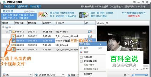 装载成功后,软件列表区中显示着光盘的相关信息。如图所示,这里举例的光盘内就有3个视频文件。我们要把这3个DVD视频文件提取出来,所以在文件前面勾选上,其它的可以不用勾选。其它的功能:双击某一视频文件就可以在预览窗口中播放,右击列表区上的视频文件,出现下拉菜单中选择“重命名”,就可以给视频换个易记的名称了。
