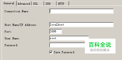 输入连接地址,本地是localhost,数据库名称,一般默认是root,mysql的端口号默认是3306,密码有则填写,没有就留空。