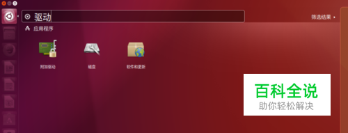 接着是使用Ubuntu自带的驱动安装器了,类似与win的驱动精灵 点击左上角的启动器,在搜索框输入“驱动” 然后搜索结果出现了,附加驱动这个程序,点击这个程序