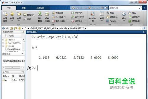 第一,直接输入法创建一维行数组。在命令行窗口(Command Window)输入如下代码:A=[pi,2*pi,exp(1),3,2^3],然后回车得到一维行数组。 A =3.1416 6.2832 2.7183 3.0000 8.0000 其中创建数组时用[ ]将数字括起来,逗号或者空格用于创建行数组,分号用于创建列数组。