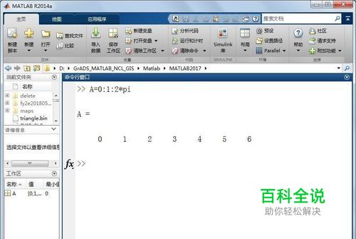 第三,步长生成法创建一维行数组。在命令行窗口(Command Window)输入如下代码:A=0:1:2*pi,然后回车得到一维行数组。 A =0 1 2 3 4 5 6 其中步长生成法的通用格式为a:inc:b,a,b为数组首尾的数字,inc为间隔。