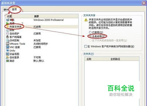 选择“选项”页面,选择“共享文件夹”,在右侧单击“总是启用”。
