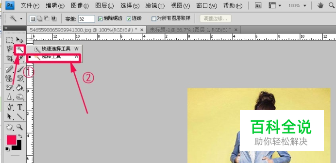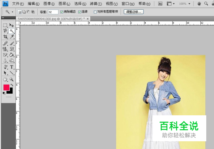 这时,ps上面出现魔棒工具的属性栏,可以在里面设置容差值。这里设置为32.(容差值越大,选择的范围越大)
