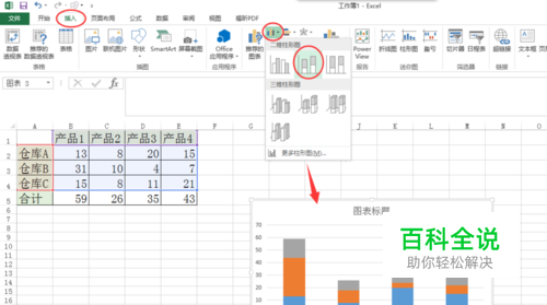 打开excel2013,建立好数据表格后,选中A1:E4单元格,点击【插入】面板中的图表,建立一个堆积柱形图。