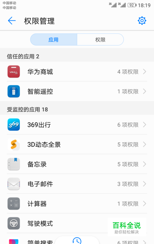打开“权限管理”后,可以看到界面显示“信任的应用”及“受监控的应用”,“信任的应用”就是完全不受手机系统监控的软件,通俗的话说就是可以随意读取你手机上的个人信息,一般当软件弹出对话框要求添加到信任软件时,最好拒绝。