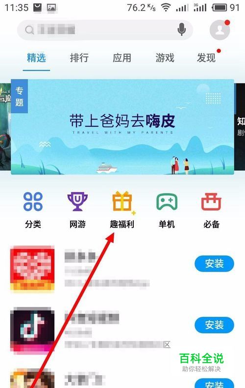 打开手机应用商店后,找到图中的趣福利入口点击进入,别的应用商店应该没有这个入口。