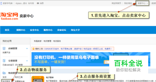 目前我们阿里巴巴账号和淘宝账号都可以申请菜鸟物流电子面单, 如果您有开通了电子面单跳过此步骤,往下看如何授权电子面单 进入淘宝,然后点击卖家中心-->点击“物流服务"-->点击“服务商设置”