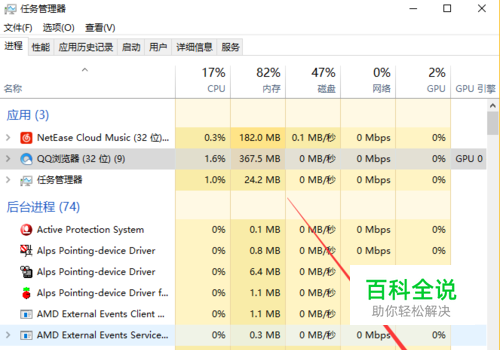 下图显示的就是在运行的软件和占用内存,有些软件是电脑必须运行的,你把运行那行下面关闭就可以了,我们以QQ浏览器为例,鼠标左键选中