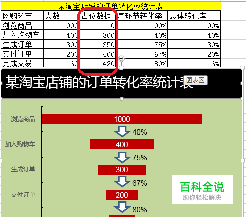 1.数据准备,如图所示,添加如图的占位数据。 由于加入购物车——400放到中间,所以占位数据(1000-400)/2=300。 由于生成订单——300放到中间,所以占位数据(1000-300)/2=350。
