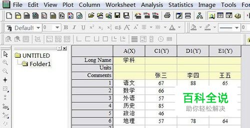 首先打开Origin作图软件,输入所需分析的数据,本文通过分析三个学生的各科成绩为例来介绍误差棒的作法;