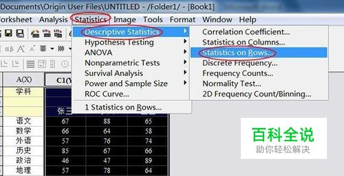 先选中三列数据,在主菜单找到“Statistics”并点击,然后依次选择“Descriptive Statistics”→“Statistics on Rows”;