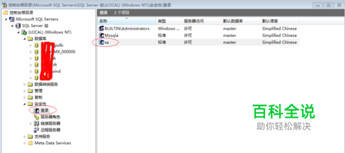 展开sqlserver组,找到要修改的实例。本例中只有一个实例Local,展开,找到“安全性”展开,然后点击“登录”,可以看到右侧窗口中有用户列表了,我们要改的是用户“sa”的密码。