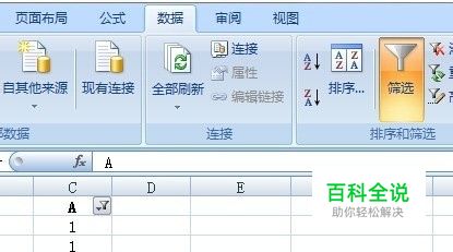 二、启动筛选。在菜单栏“数据”中,选中“筛选”项,此时,A列数据会显示出一个下拉箭头。