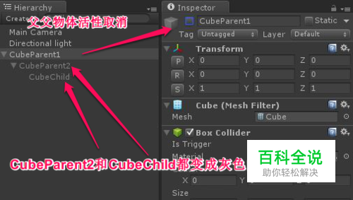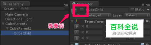 常用解决办法2:出现问题的物体的父物体、父父物体、父父父物体......没有激活活性,因为一个父物体的活性取消的话,unity系统默认的就无法搜索到他的所有自物体了,即使这个时候你单独打开自物体的属性面板,发现子物体的活性小勾√还在,这个自物体依然是 Object reference not set to an instance of an object.