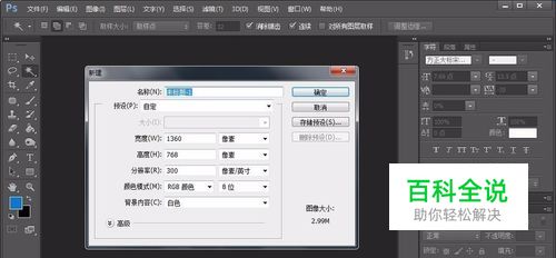 打开软件,然后新建图层,尺寸为1360X768,分辨率为300,当然也可以自定义尺寸和分辨率,如图所示: