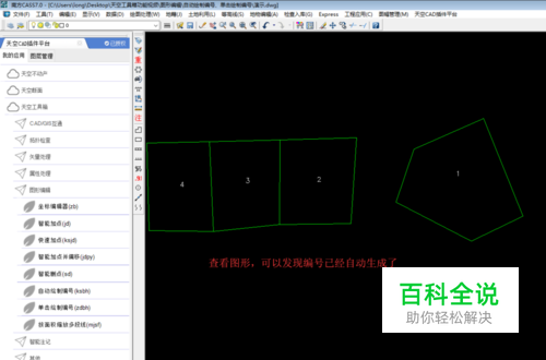 比如: 我想对当前CAD中的闭合多段线进行自动编号, 首先 我们执行 自动绘制编号功能,然后 根据软件提示,选择需要编号的闭合多段线,点击 回车键; 接着,按照软件提示:我们输入编号的起始值,这里我输入 1,点击 回车键; 我们通过查看图形可以发现,软件已经按照我们的要求绘制好编号了。