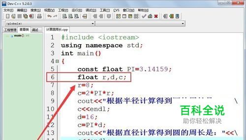 接着,定义三个实数类型的变量,用来保存圆的半径、直径和周长。