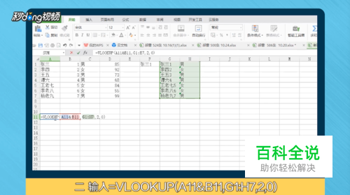 输入=VLOOKUP(A11&B11,G1:H7,2,0)>可根据指定的两个条件提取一个结果。
