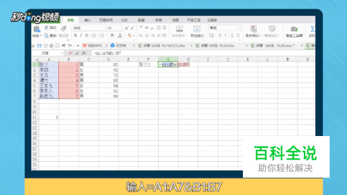 输入=A1&B1可将两个单元格内容合并>输入=A1:A7&B1:B7>点击右下角并下拉>可将两列内容合并,输入=IF({0,1},A1:A7&B1:B7,C1:C7)可提取结果。