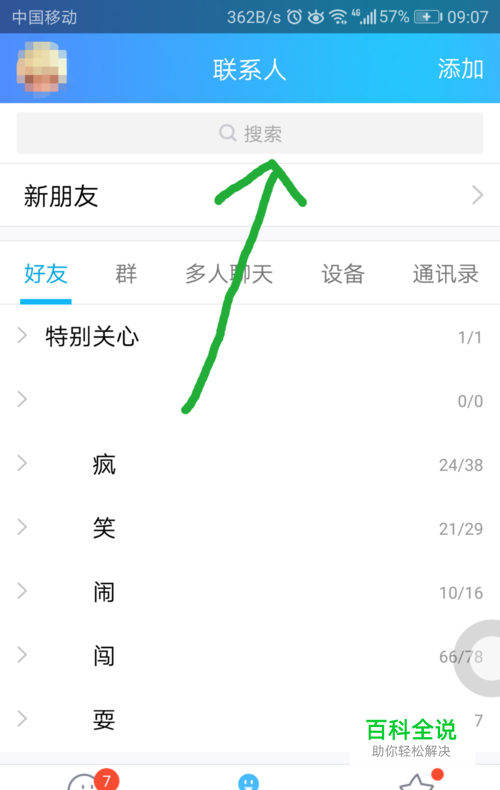打开手机QQ(同时电脑上也要登陆QQ),在联系人界面点击搜索。