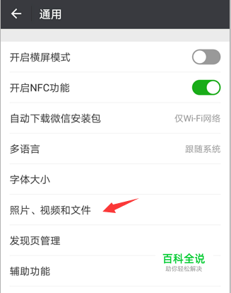 选择“通用“,打开“照片,视频和文件”,关闭自动下载,如图