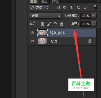 选中背景层,将背景层拖动至图层面板下方的新建图层按钮上,复制副本。