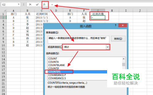 如图,我们定位至【g2】单元格,点击fx按钮,在【统计】类别的函数中找到【countifs】