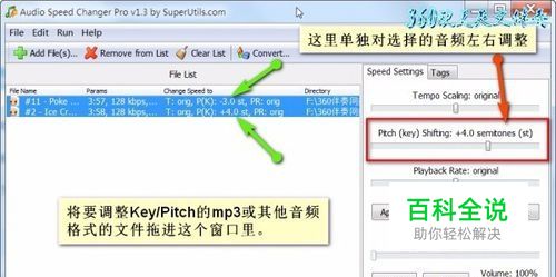 打开软件,把需要改调的音频文件拖进去。 可以在左边对所选音频文件单独左右调整Key。 Audio Speed Changer Pro 是一款音频加速工具,让你不改变音调加速音频文件。它主要用于加速声读物以及播客,除此以外还可用于任何其他的音轨或文件。批量处理功能及方便的用户界面对想节省时间的有声读物听众和制作者来说,这实在是一款实用的工具.SuperUtils Audio Speed Changer功能特色:-作为输入格式,可处理MP3, OGG, WAV and AAC/MP4/M4A/M4B文件格式.1.批量处理功能,可列表中各个文件指定节奏速度,变调和播放速率.2.转换前可预览更改3.支持的配置输出MP3, OGG, PCM/WAV 和 AAC/MP4文件格式.4.编辑个人标签.5.低混为单声道功能6.输出文件调为相同音量级功能.7.整合到资源管理器中,快速访问主要功能.