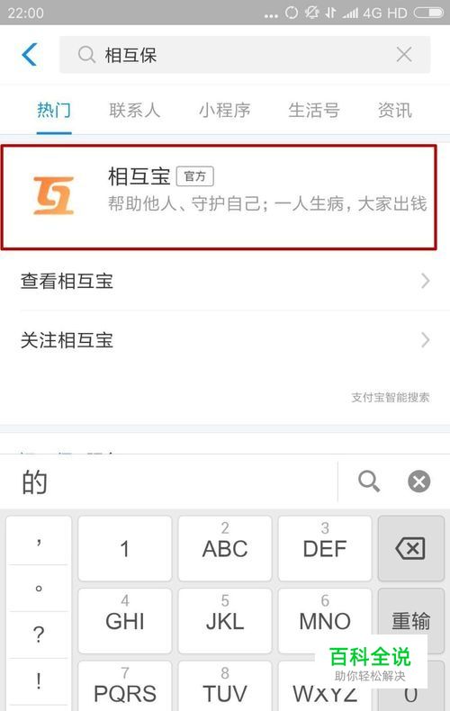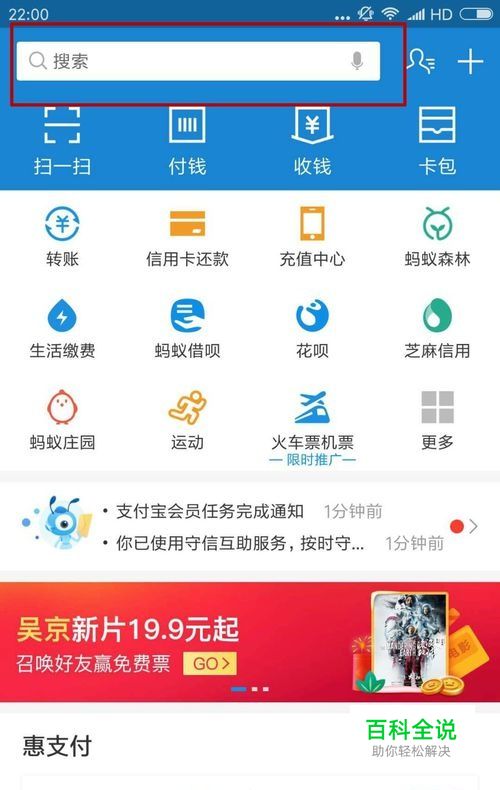 我们进入支付宝首页,在顶部搜索栏输入“相互宝”。