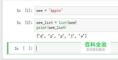 new = "Apple" new_list = list(new) print(new_list) 定义一个变量,这个变量里面是一个英语单词。 我们需要新建一个列表,然后把这个变量放进去,那么打印出来的结果就会自动分割每个字母,形成一个新的列表。