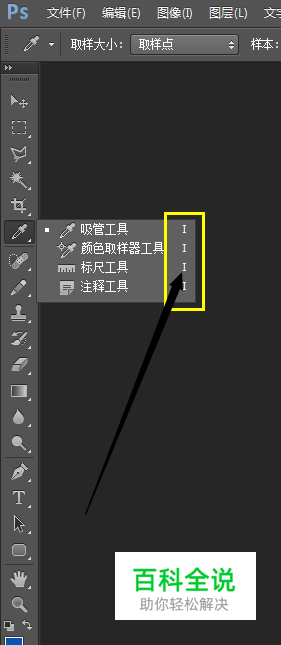 要想知道每个工具的快捷键其实很简单,就拿拾色器来说,只要把鼠标指针悬停到该工具的图标上大概1秒左右,就会提示(吸管工具I),很显然它的快捷键就是“I”还一个方法就是把鼠标悬停到该图标,然后右击。会出现相应的工具图标及名字,名称后面的字母就是该工具的图标....