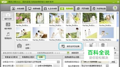 为图片设置名字和注释 数码大师可以为图片显示相片名和注释,我们可以点击“修改名字和注释”按钮自己设置文字内容,当然也可以在“注释”选项卡的显示方式处设置成不显示,将相片名和注释去掉。在“修改名字和注释”界面,我们还可以通过鼠标左键对相片顺序重新调节。