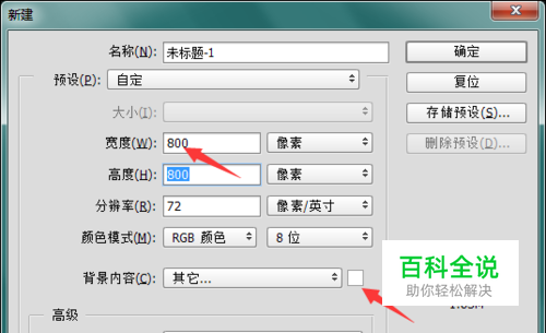 首先要软件中新建一下画布。画布的大小这里设置为800*800像素。把它的分辨率设置为72像素。颜色模式为默认的RGB。把背景内容选择后面的颜色更改为想要的颜色。这里直接在弹出的拾色器中把它更改为白色。点击确定。