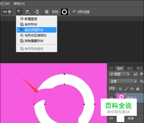 在拉第一个形状的时候,默认的是新建图层。当要画第一个形状的时候,需要把它的选项直接更改为想要的类型。如果想要减去相交部分外的形状的话,就直接在路径操作中选择减去顶层形状。这样画出来的第二个形状。相交部分就会减去。
