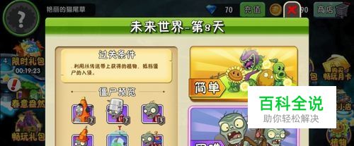 未来世界第8天困难篇,传送带所给的植物很有限,输出不够的话很难过的。过这关的前提:竖果、激光豆最少2级;这个比较容易达成,每天的签到和挑战就能很快凑够相应的碎片,用来升级了。