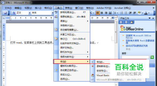 那么我们怎么来设置自动翻页呢?首先打开Word文档,在菜单栏上找到工具选项,在弹出 的下拉菜单栏中选择宏命名,宏命令还有子菜单,继续选择宏命令: