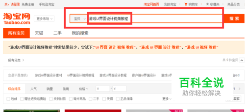 首先我们进入淘宝(之所以选择淘宝,因为淘宝的量很大),输入我们需要的关键词进行搜索,如:游戏UI界面设计视频教程、游戏UI教程等都可以