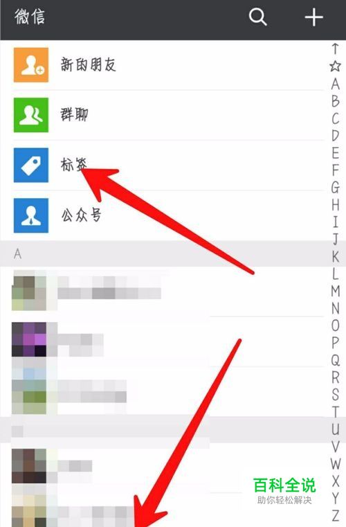 然后在主页点击底部的 通讯录,再点击箭头指向的 标签。