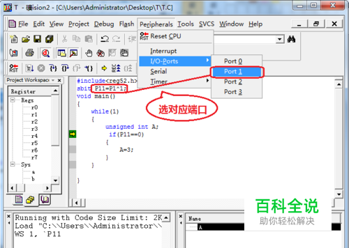 第二步:调出I/O口模拟输出输入设置窗口:点击”Peripherals“→"I/O-Ports"→"Port1",这里我选"Port1"是因为我的I/O用P1^1。具体操作如下: