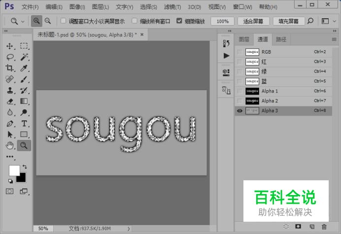 按住Ctrl键点击文字图层的缩略图调出选区;然后,选择选区工具,在选区上鼠标右键选择“存储选区”;接着,我们命名通道为“Alpha 1”。